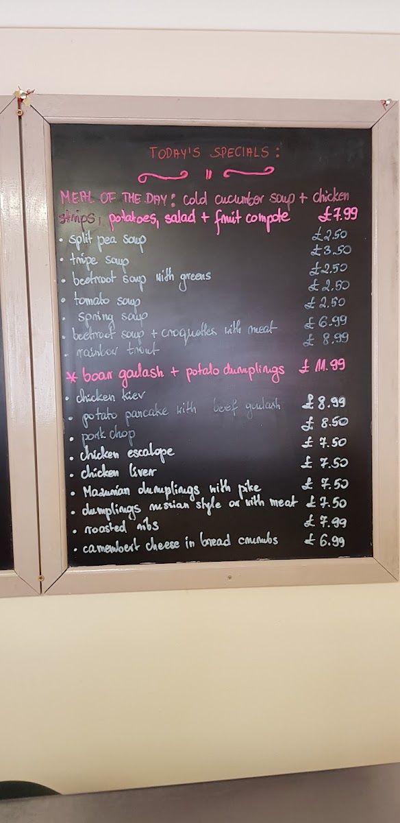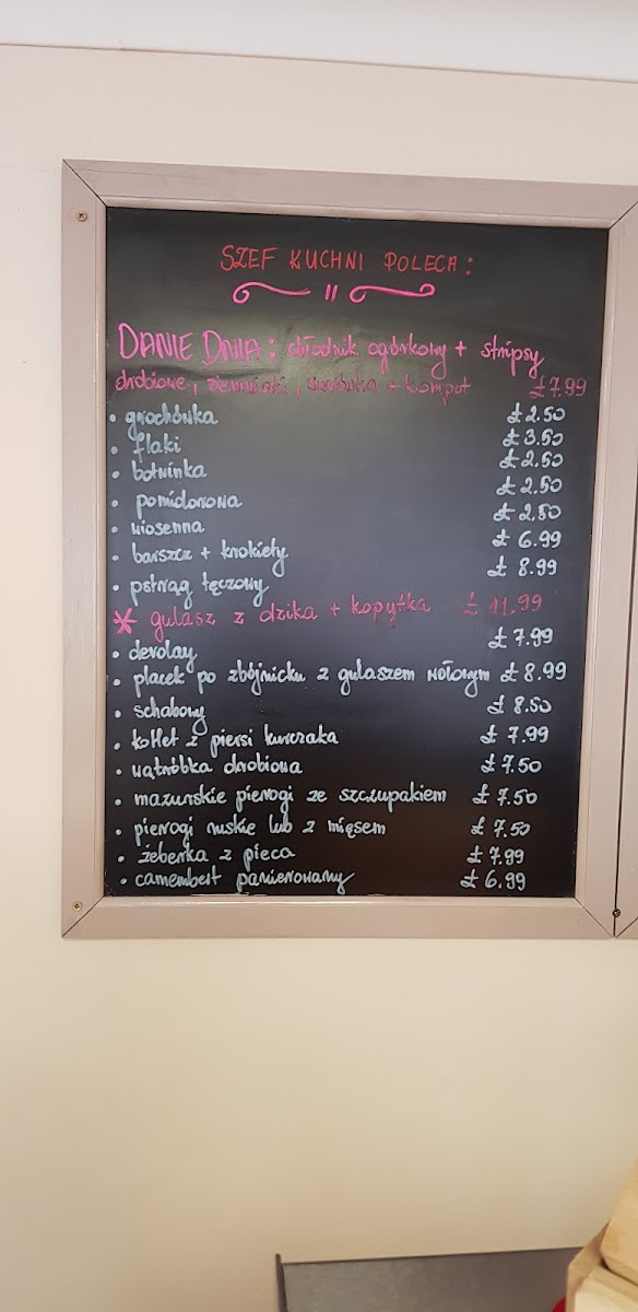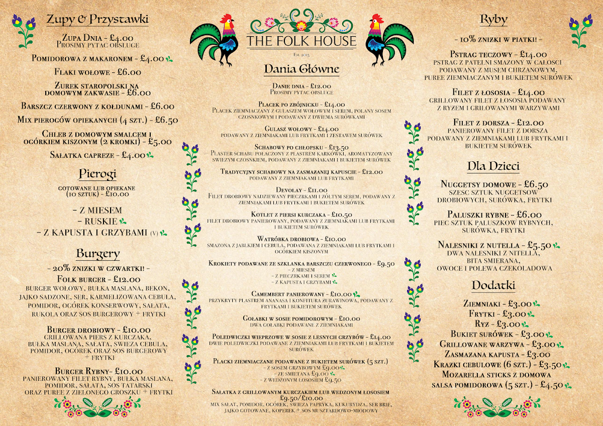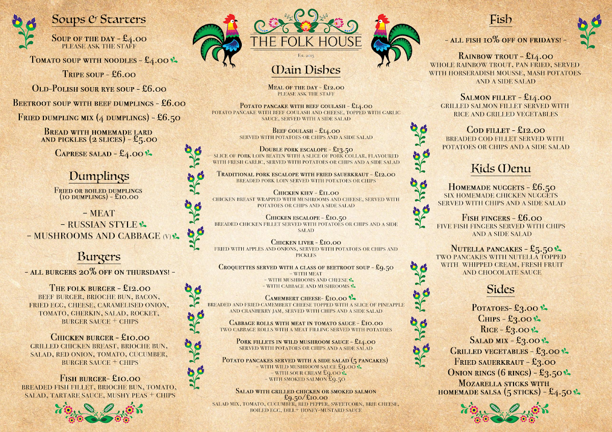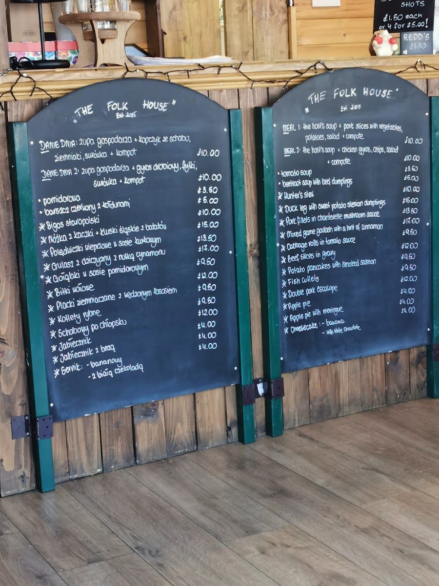In conclusion, The Folk House Ltd offers a hearty and comforting menu rooted in Eastern European flavors, with a satisfying variety across each section. The daily highlights such as Jagoda's Village Soup, Ukrainian Beetroot Soup, and Fried Camembert, along with the Meal Of The Day - 13/02 featuring Cabbage Roll Cutlets In Tomato Sauce, showcase traditional, home-style cooking. Starters like Tripe Soup, Tomato Soup With Noodles, and Mini Croquettes With Meat set a warm tone, while mains such as Cod Fillet, The 'Bandit' Pancake, The Hungarian Pancake, and 5pcs Potato Pancakes provide filling and flavorful options. The dumpling selection-10pcs Cabbage And Mushroom Dumplings, 10pcs Meat Dumplings, and 10pcs Russian Style Dumplings-is particularly appealing for those seeking authentic comfort food. Casual bites like The Folk Dog and various Zapiekanka options add a street-food twist, and the children’s menu, including 5pcs Fish Fingers & Chips and 6pcs Chicken Nuggets & Chips, ensures family-friendly appeal. Desserts such as 2pcs Nutella Pancakes, Belgian Waffle, and Homemade Cheesecake round off the experience nicely. While prices are not listed, the menu feels generous, diverse, and well-suited for anyone craving traditional Polish and Eastern European cuisine in a relaxed setting.