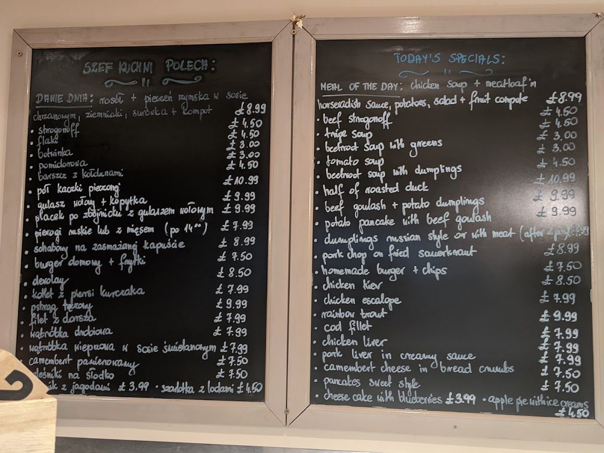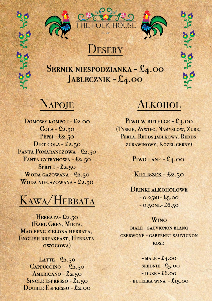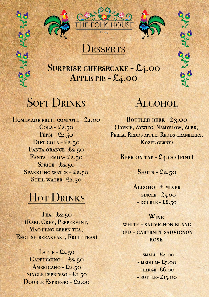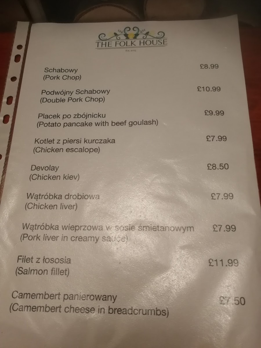 In conclusion, The Folk House Ltd offers a hearty and comforting menu rooted in Eastern European flavors, with a satisfying variety across each section. The daily highlights such as Jagoda's Village Soup, Ukrainian Beetroot Soup, and Fried Camembert, along with the Meal Of The Day - 13/02 featuring Cabbage Roll Cutlets In Tomato Sauce, showcase traditional, home-style cooking. Starters like Tripe Soup, Tomato Soup With Noodles, and Mini Croquettes With Meat set a warm tone, while mains such as Cod Fillet, The 'Bandit' Pancake, The Hungarian Pancake, and 5pcs Potato Pancakes provide filling and flavorful options. The dumpling selection-10pcs Cabbage And Mushroom Dumplings, 10pcs Meat Dumplings, and 10pcs Russian Style Dumplings-is particularly appealing for those seeking authentic comfort food. Casual bites like The Folk Dog and various Zapiekanka options add a street-food twist, and the children’s menu, including 5pcs Fish Fingers & Chips and 6pcs Chicken Nuggets & Chips, ensures family-friendly appeal. Desserts such as 2pcs Nutella Pancakes, Belgian Waffle, and Homemade Cheesecake round off the experience nicely. While prices are not listed, the menu feels generous, diverse, and well-suited for anyone craving traditional Polish and Eastern European cuisine in a relaxed setting.